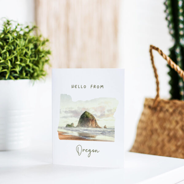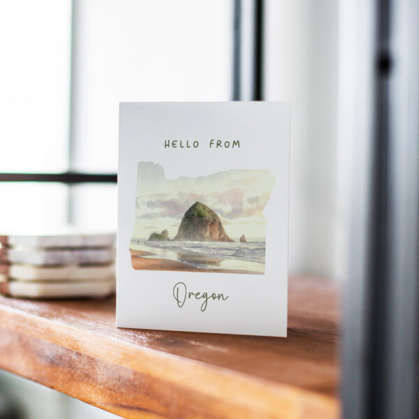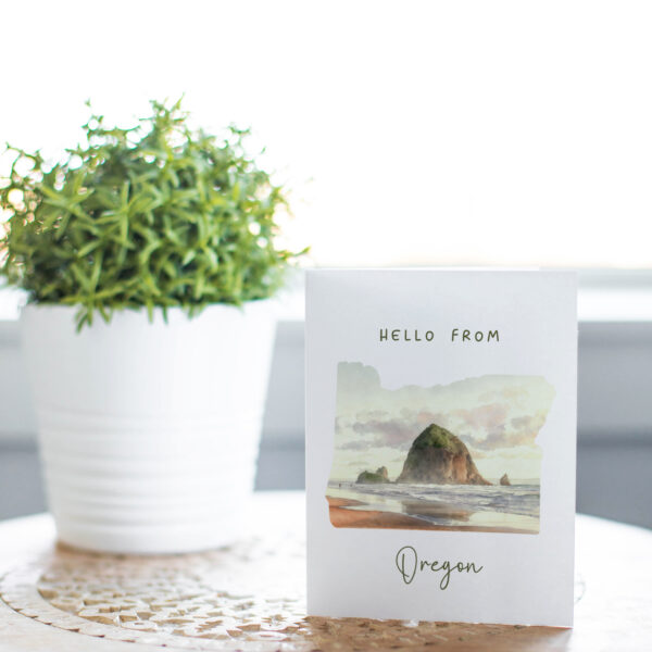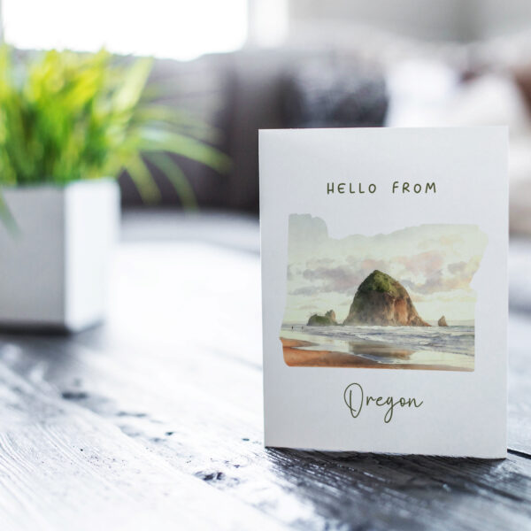 Send a little piece of the Pacific Northwest with this “Hello from Oregon” greeting card. Featuring a soft watercolor illustration of Oregon’s iconic Cannon Beach Haystack Rock, this design captures the beauty and calm of the Oregon Coast.